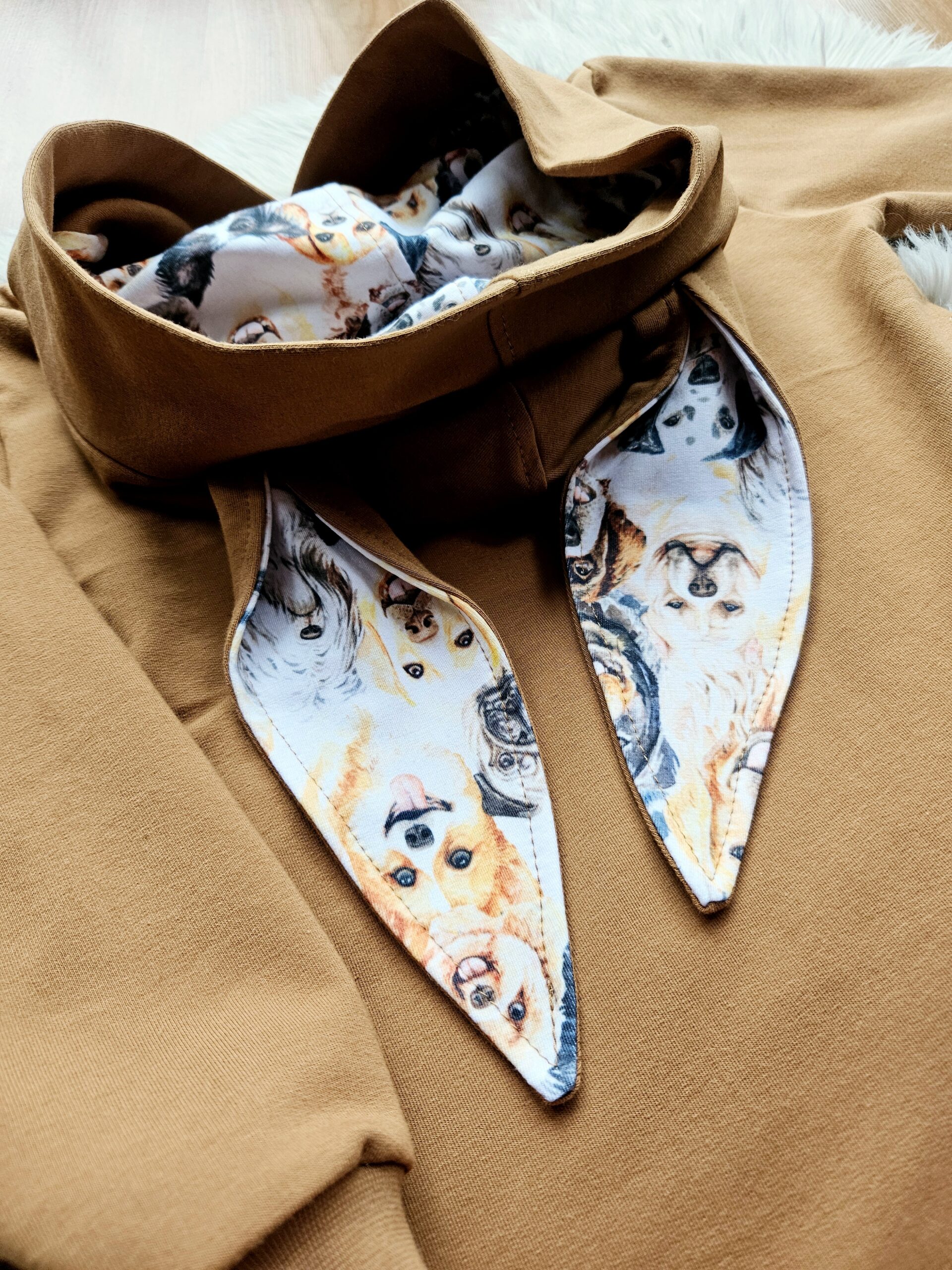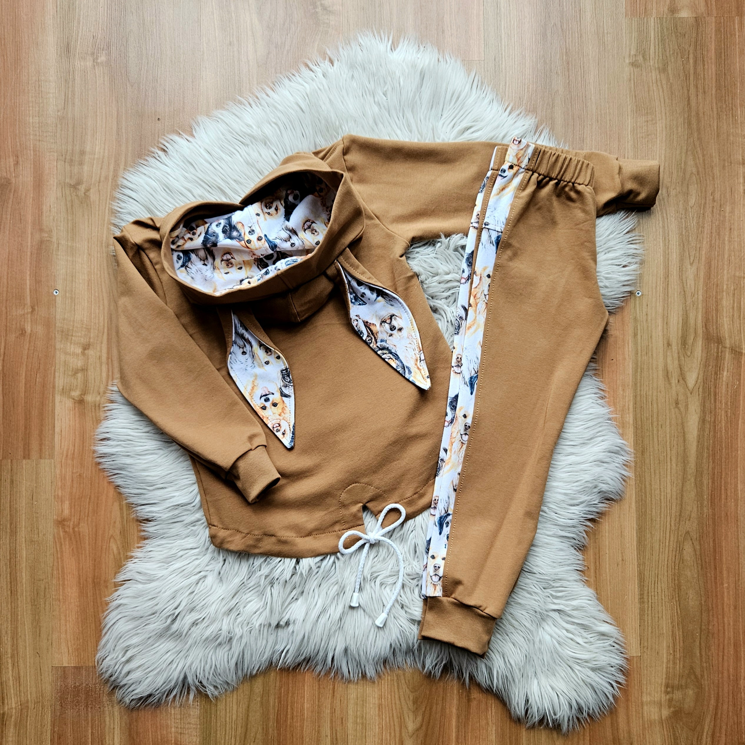 Wyjątkowo piękny dziecięcy zestaw dresowy o pięknej kolorystyce: karmelowy z motywem piesków. Zestaw składa się z bluzy oraz spodni.