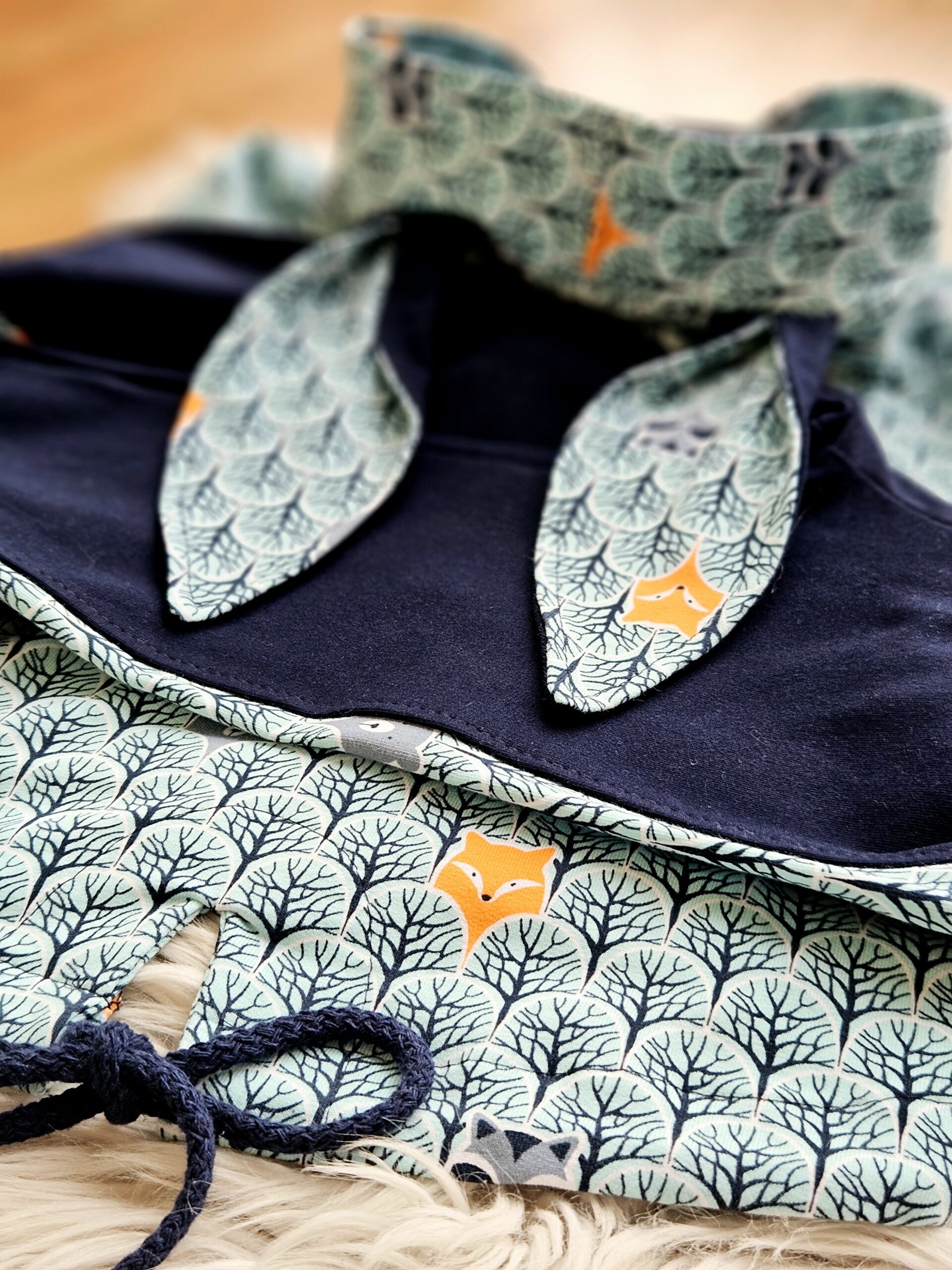 Bluza ma wszyte do kaptura urocze uszy. Dół bluzy można regulować sznurkiem.