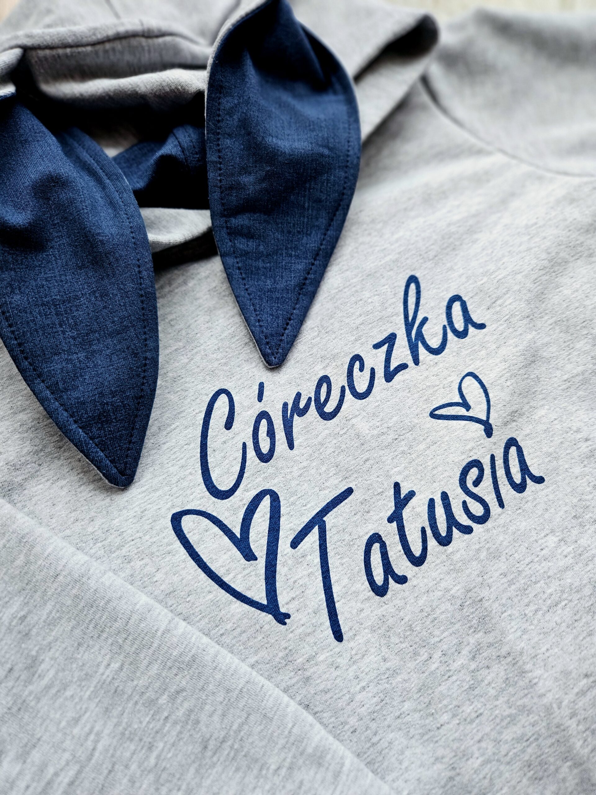 Wyjątkowo piękny dziecięcy zestaw dresowy. Szara kolorystyka z dodatkiem granatowych elementów i napisem „córeczka tatusia”. Zestaw składa się z bluzy oraz spodni.