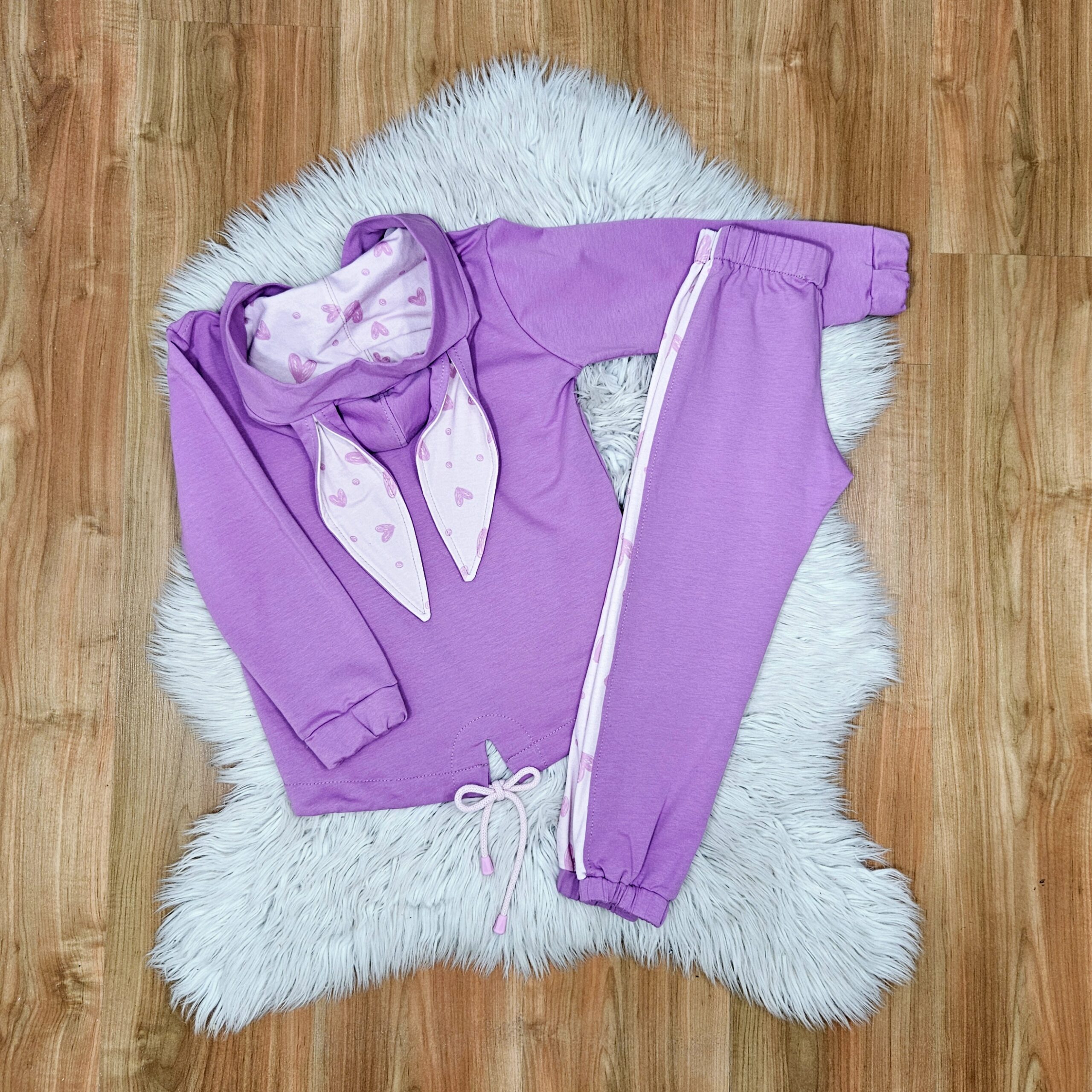 Wyjątkowo piękny dziecięcy zestaw dresowy o energetycznej kolorystyce: róż/fiolet z delikatnym dodatkiem różowych serduszek. Zestaw składa się z bluzy oraz spodni.