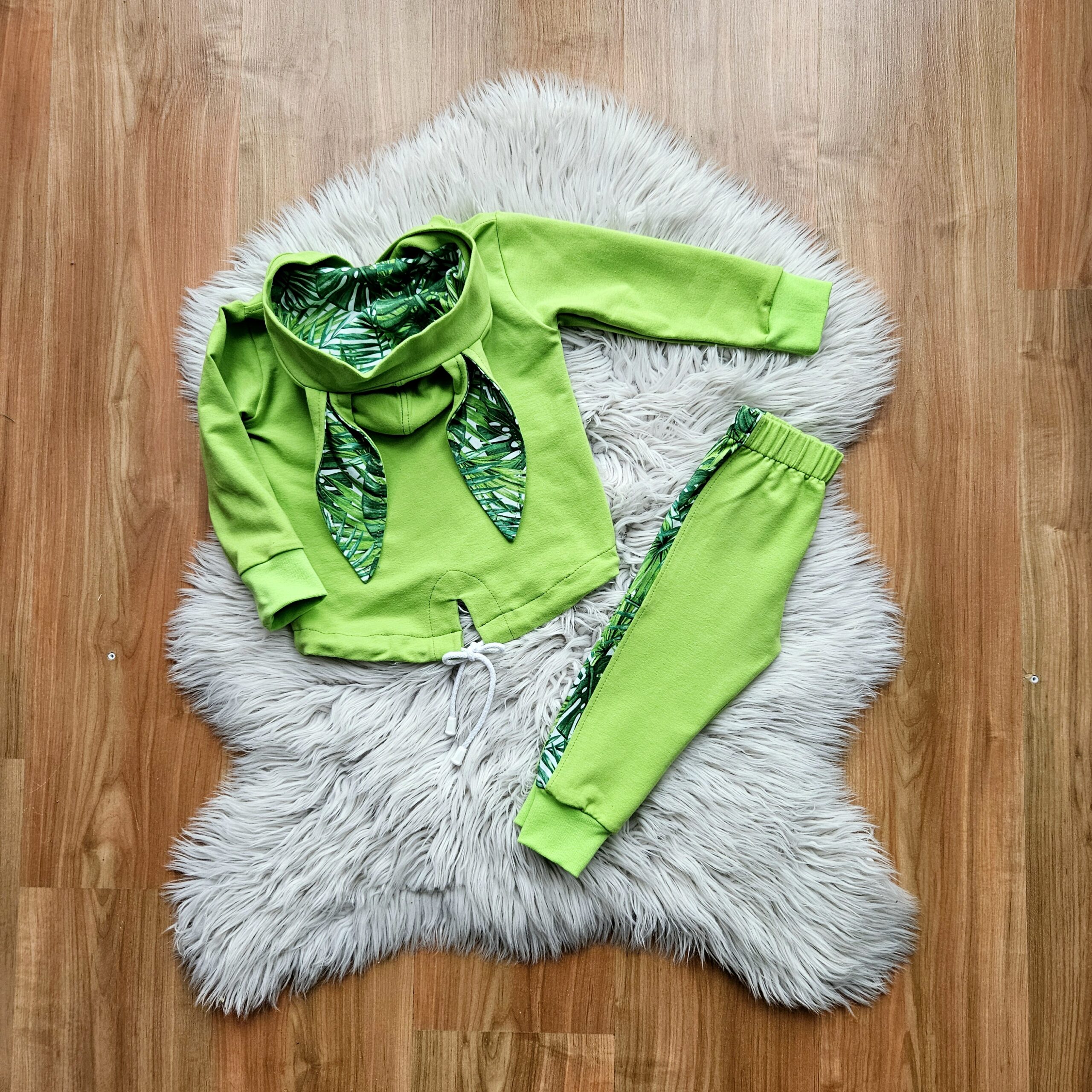 Wyjątkowo piękny dziecięcy zestaw dresowy o energetycznej kolorystyce z motywem liści. Zestaw składa się z bluzy oraz spodni.
